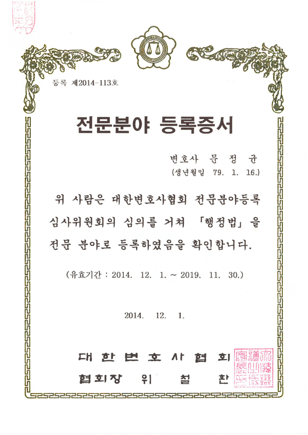 대한변호사협회 행정법 전문변호사 등록 이라고 적혀있는 란 바로 밑에